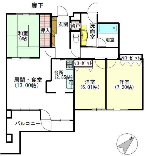 3LDK LD13.0帖+K2.85帖+洋室(6.01+7.2)帖+和室6.0帖 |